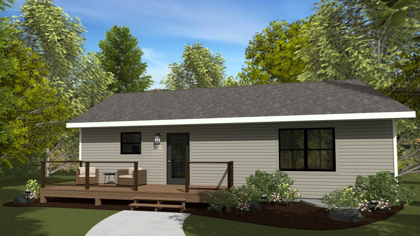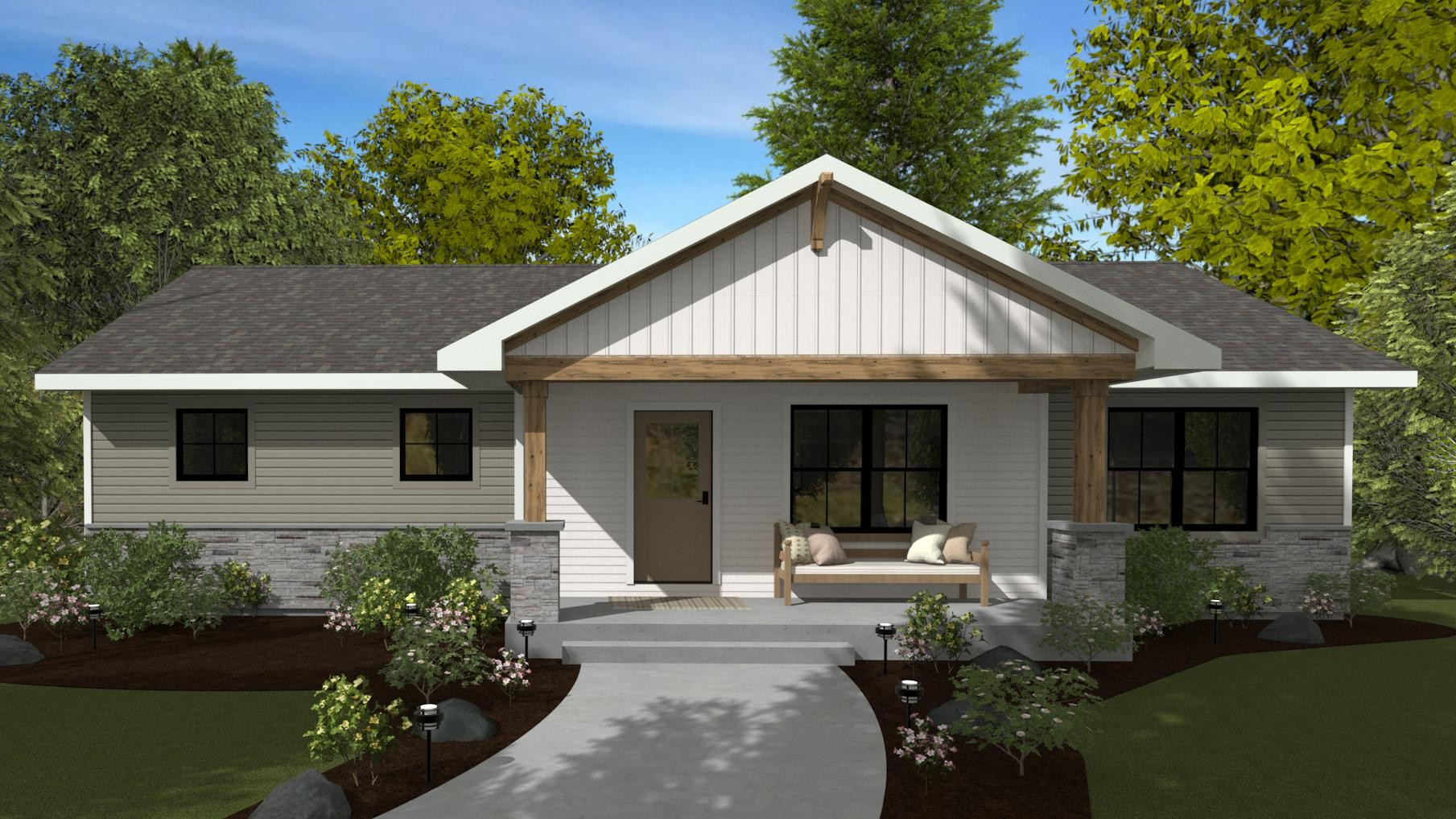 The 990 square feet of main-level living space fits efficiently on a compact footprint, making the Moonstone well-suited for city, suburban, and narrow/small lots.